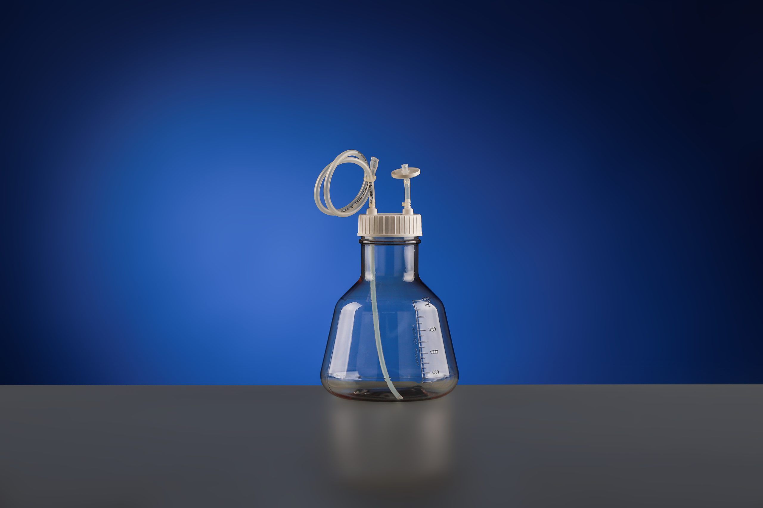 1000mL PETG Erlenmeyer Flask, Flat Bottom, with Bi-Directional Transfer Cap, TPE Tube (50cm 1/8″ ID 1/4″ OD) , Heat seal, Vent Filter (0.22 μm 13.8cm²), Sterile