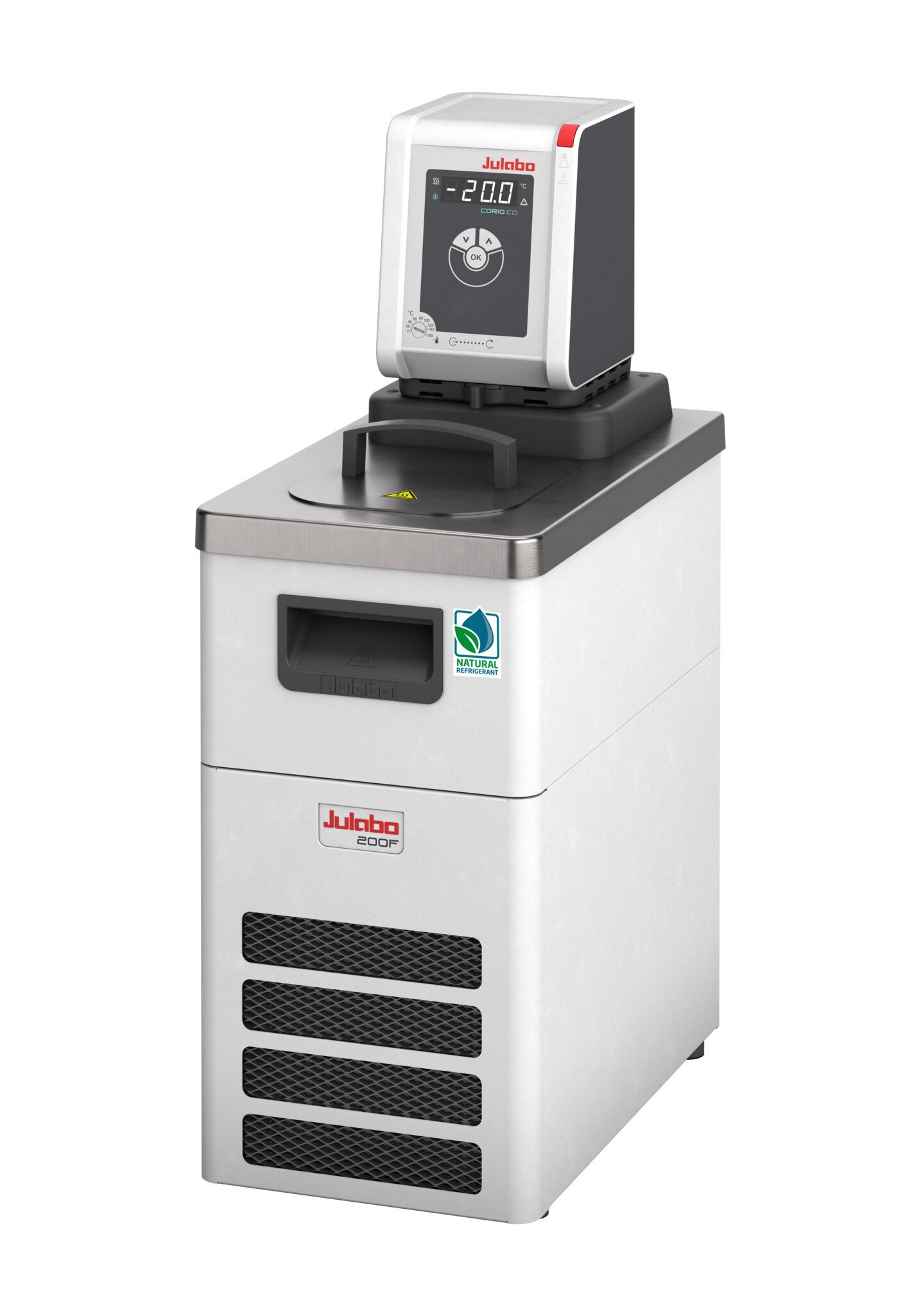 CORIO CD-200F refrigerated/heating circulator, -20…+150 °C range with 1kW heating power. Cooling power: 0.2kW at 20 °C, 0.17kW at 0 °C, 0.13kW at -10 °C, 0.06kW at -20 °C. Centrifugal pump to 16L/min, 4.8psi. Maximum fluid viscosity 50cSt. 3-4L SS bath tank, USB-B communication port, USB-A data-logging; usable opening 5.1 x 5.9/5.9 inches (WxL/D); Dimensions: 9.1 x 15.4 x 25.6 inches (WxLxH), 57.3 lbs. R290 refrigerant. 115V/60Hz with NEMA N5-15 plug. M16x1 threaded pump connections with 8mm and 12mm hose barbs.