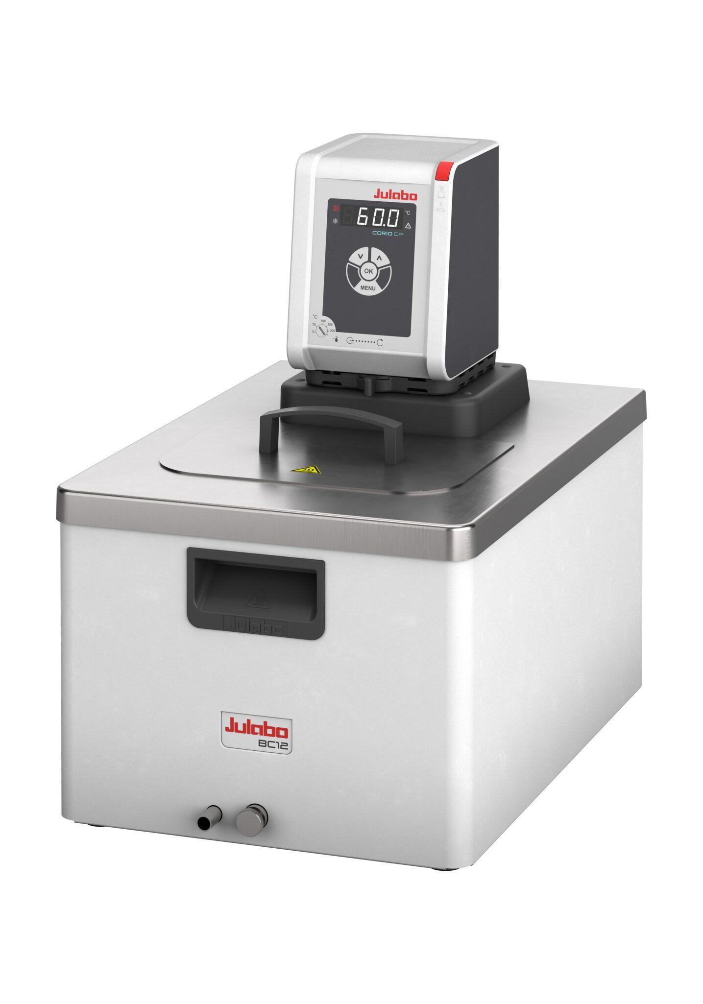 CORIO CP-BC12 heating circulator, +20…+200 °C range with 2kW heating power with integrated cooling coil. Adjustable centrifugal pump to 8-27L/min, 1.5-10.2psi. Maximum fluid viscosity 50cSt. 8.5-12L SS bath tank with integrated drain port, USB-B and RS232 communication ports, USB-A data-logging; usable opening 8.7 x 5.9/7.9 inches (WxL/D); Dimensions: 13 x 19.3 x 18.5 inches (WxLxH), 26.5 lbs. 230V/60Hz with NEMA N6-15 plug. M16x1 threaded pump connections with 8mm and 12mm hose barbs. UL/CSA marked.