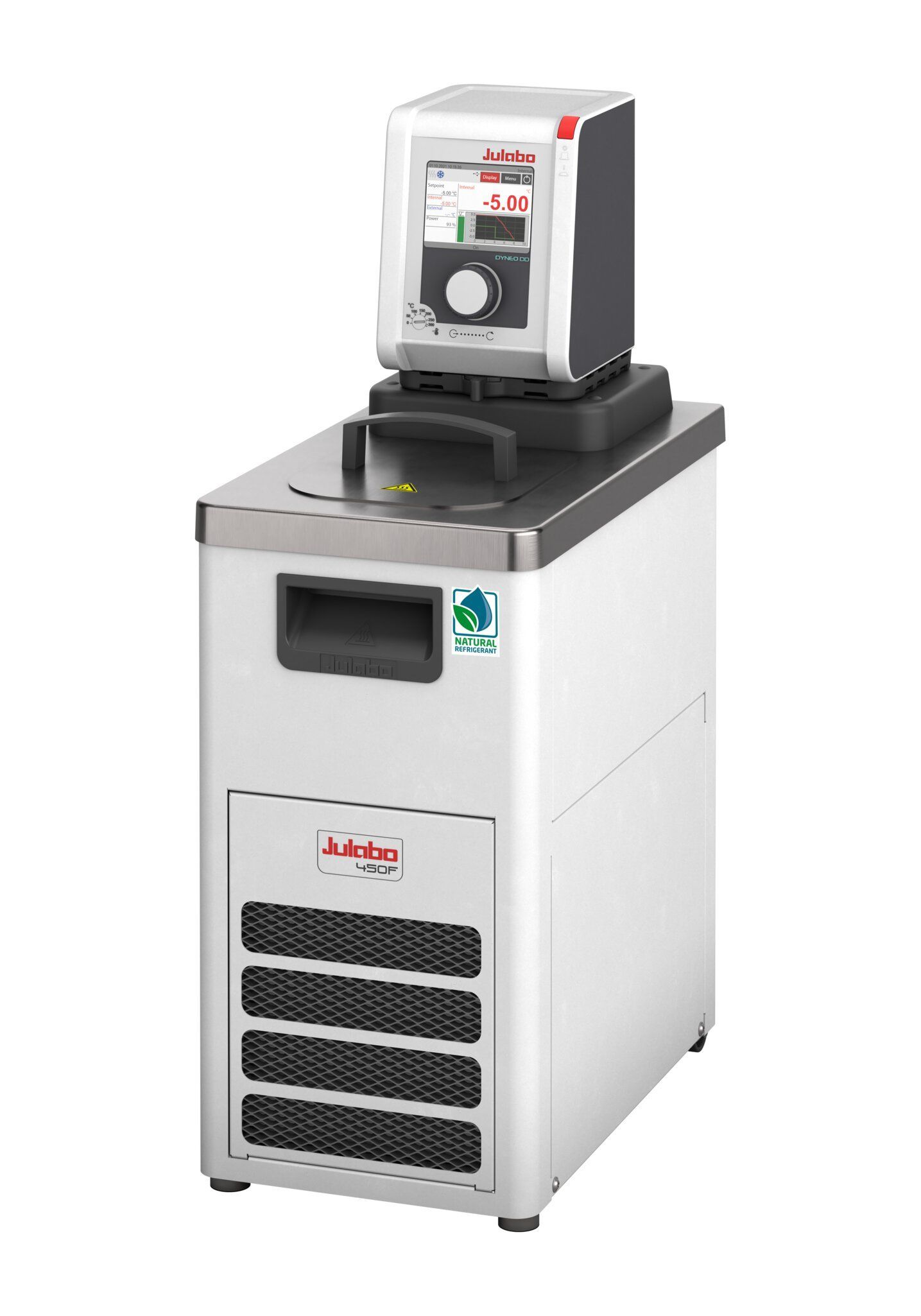 DYNEO DD-450F refrigerated/heating circulator, -30…+200 °C range with 1kW heating power. Cooling power: 0.44kW at 20 °C, 0.37kW at 0 °C, 0.27kW at -10 °C, 0.16kW at -20 °C, 0.03kW at -30 °C. Adjustable centrifugal pump to 8-27L/min, 1.5-10.2psi. Maximum fluid viscosity 50cSt. 3-4L SS bath tank, USB-B and RS232 communication ports, USB-A data-logging; Pt100 port for external control, programmable; usable bath opening 5.1 x 5.9/5.9 inches (WxL/D); Dimensions: 9.1 x 15.4 x 25.6 inches (WxLxH), 60.4 lbs. R290 refrigerant. 115V/60Hz with NEMA N5-15 plug. M16x1 threaded pump connections with 8mm and 12mm hose barbs.