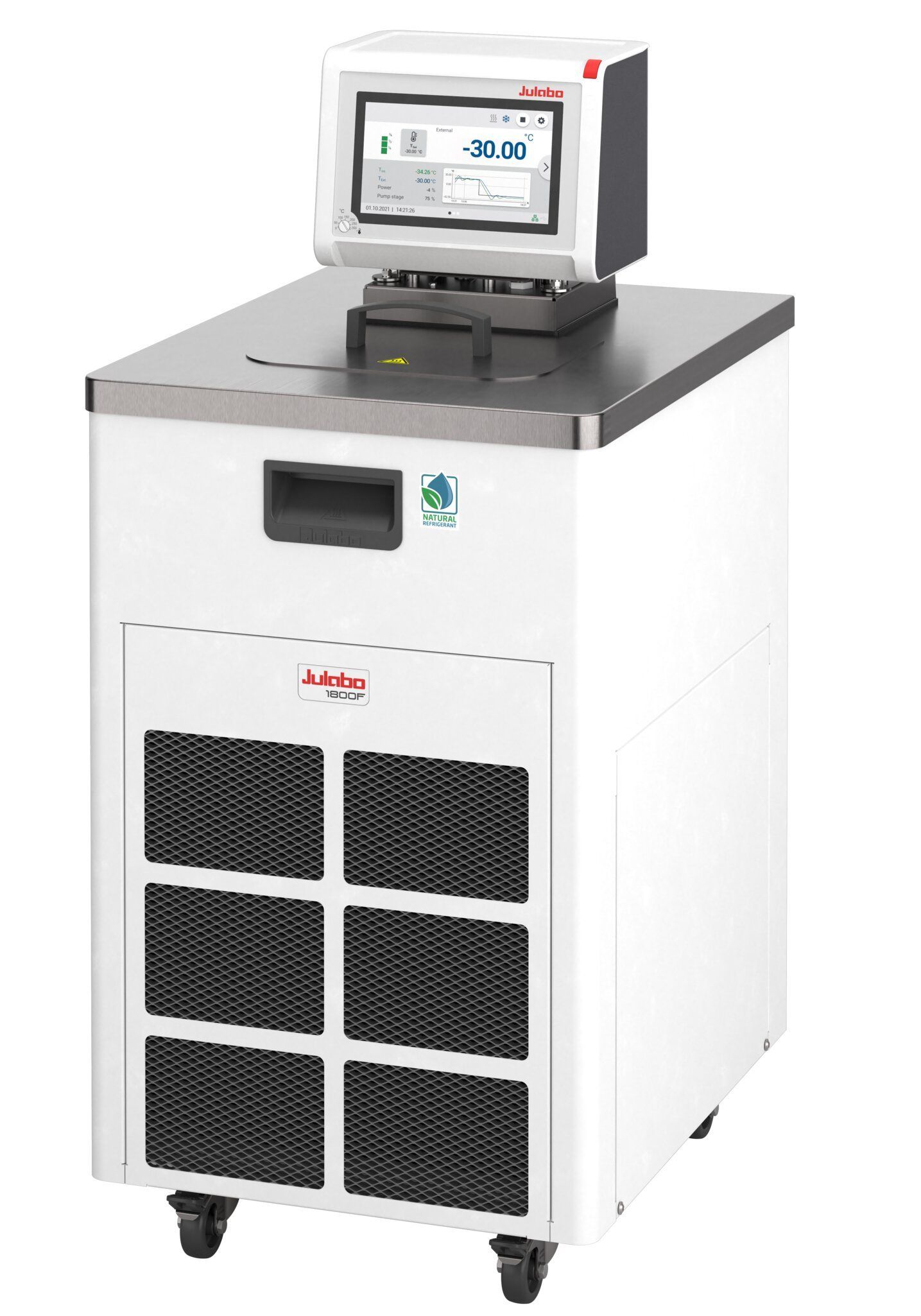 MAGIO MX-1800F refrigerated/heating circulator, -50…+200 °C range with 2kW heating power. Cooling power: 1.87kW at 20 °C, 1.57kW at 0 °C, 0.77kW at -20 °C, 0.47kW at -30 °C, 0.3kW at -40 °C. Adjustable pressure/suction centrifugal pump 16-31L/min, 3.5-13.3psi. Maximum fluid viscosity 70cSt. 6.5-11L SS bath tank, USB-B, RS232/RS485, Ethernet communication ports, USB-A data-logging; Pt100 port for external control, programmable; usable bath opening 7.1 x 5.1/7.9 inches (WxL/D); Dimensions: 15.7 x 19.7 x 35inches (WxLxH), 134.5 lbs, with locking casters; R1270 refrigerant. 200-230V/50-60Hz with NEMA N6-20 plug. M16x1 threaded pump connections with 8mm and 12mm hose barbs.