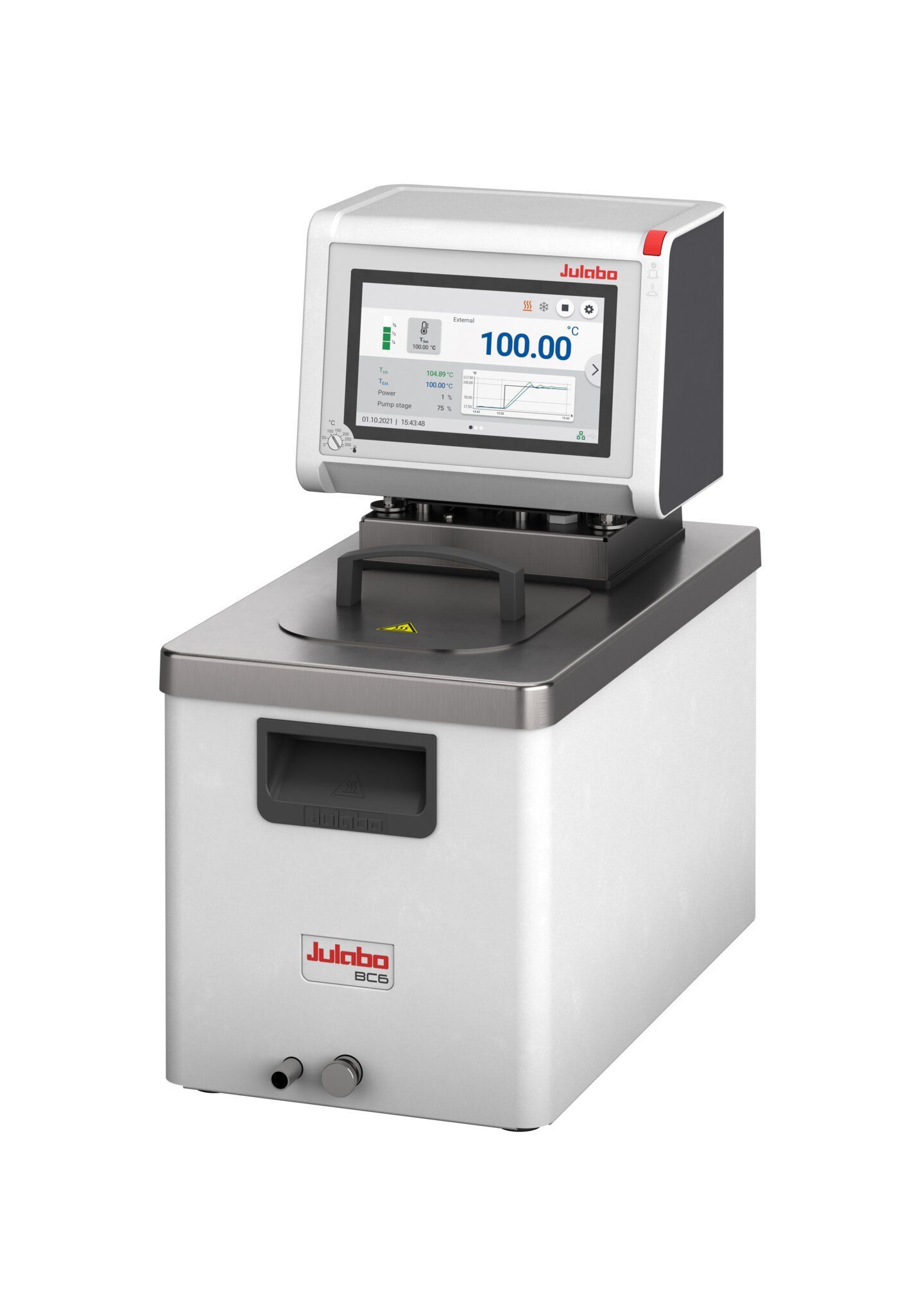 MAGIO MX-BC6 heating circulator, +20…+300 °C range with 3kW heating power and integrated cooling coil. Adjustable pressure/suction centrifugal pump 16-31L/min, 3.5-13.3psi. Maximum fluid viscosity 70cSt. 4.5-6L SS bath tank with integrated drain valve, USB-B, RS232/RS485, Ethernet communication ports, USB-A data-logging; Pt100 port for external control, programmable; usable bath opening 5.1 x 5.9/7.9 inches (WxL/D); Dimensions: 9.4 x 17.3x 18.5 inches (WxLxH), 28.2 lbs. 200-230V/50-60Hz with NEMA N6-20 plug. M16x1 threaded pump connections with 8mm and 12mm hose barbs.