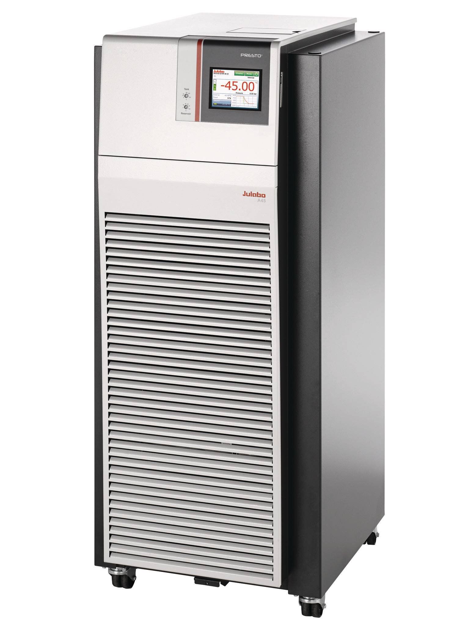 PRESTO A45 operating range -45…+250 °C with 5.5-6kW heating power. Cooling power: 3.5kW at 20 °C, 3.1kW at 0 °C, 2.5kW at -10 °C, 1.8kW at -20 °C, 0.7kW at -30 °C, 0.2kW at -40 °C. Adjustable pump 0…80L/min; 1.5…43.5 PSI, 50cSt fluid viscosity maximum, M30x1.5 threaded pump connections. Minimal internal process volume 7.5L with 7.5L internal expansion volume. Dimensions: 20.9 x 26.2 x 49.6 inches (WxLxH); 463 lbs. 208-230V/3PPE/60Hz bare wire. R449A refrigerant.