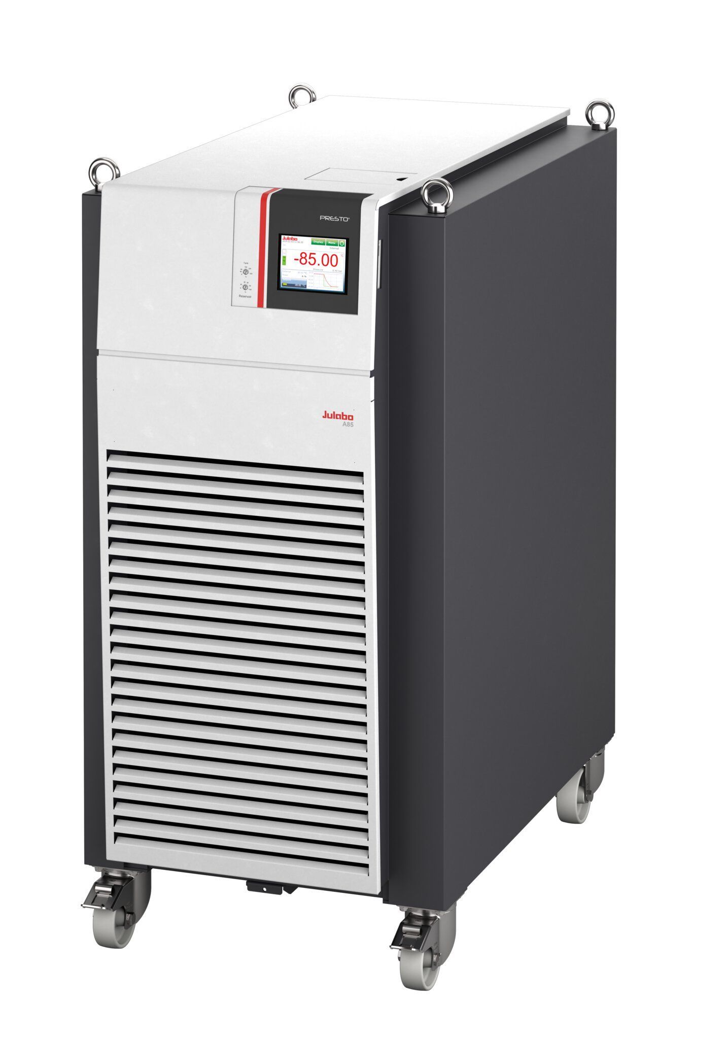 PRESTO A85t, operating range -85…+250 °C with 12.5-15kW heating power. Cooling power: 2.5kW at 20 °C, 2.4kW at 0 °C, 2.4kW at -20 °C, 2.4kW at -30 °C, 2.4kW at -40 °C, 2.2kW at -60 °C, 0.4kW at -80 °C. Adjustable pump 0…80L/min; 1.5…43.5 PSI, 50cSt fluid viscosity maximum, M30x1.5 threaded pump connections. Minimal internal process volume 9.5L with 7L internal expansion volume. Dimensions: 24 x 42.5 x 49.2 inches (WxLxH); 804.7 lbs. 208-230V/3PPE/60Hz bare wire. R507/R23 refrigerants
