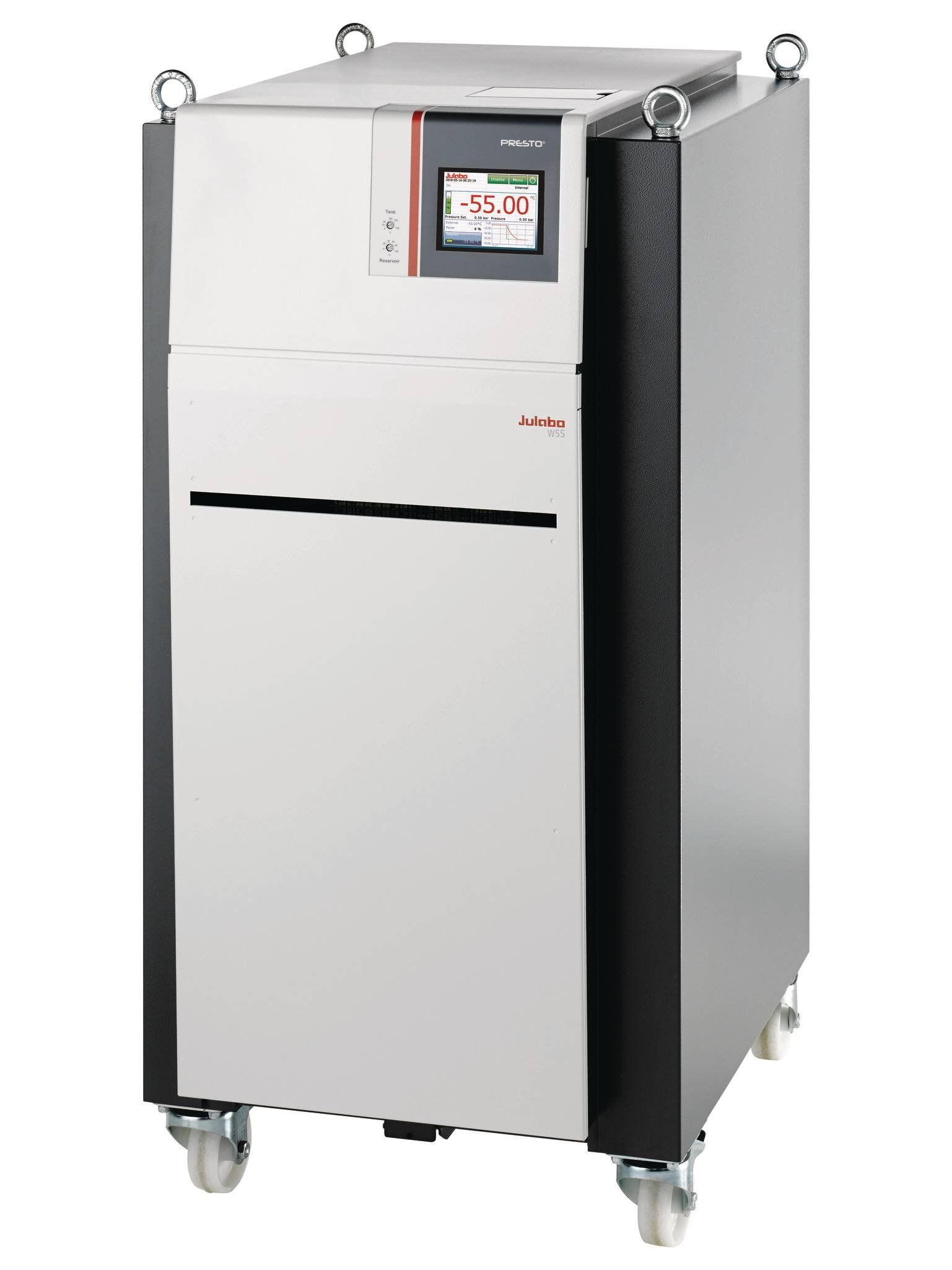 JULABO PRESTO® Highly Dynamic Temperature Control Systems provide fast and precise liquid temperature control for external applications. PRESTO provide large heating and cooling capacities covering a working temperature range from -92 °C to +250 °C. Systems provide high flow rates, a controlled build-up of pump pressure with integrated pressure control. Changes in the temperature-control fluid viscosity are balanced dynamically. Integrated 5.7’’ industrial color touch screen; multi-lingual with programmability and user level management. Systems include external Pt100 sensor capability, RS232, Ethernet, USB I/O with integrated TCP/IP ModBus communication. Optional analog module. USB-A and SD memory card slots for data-recording.