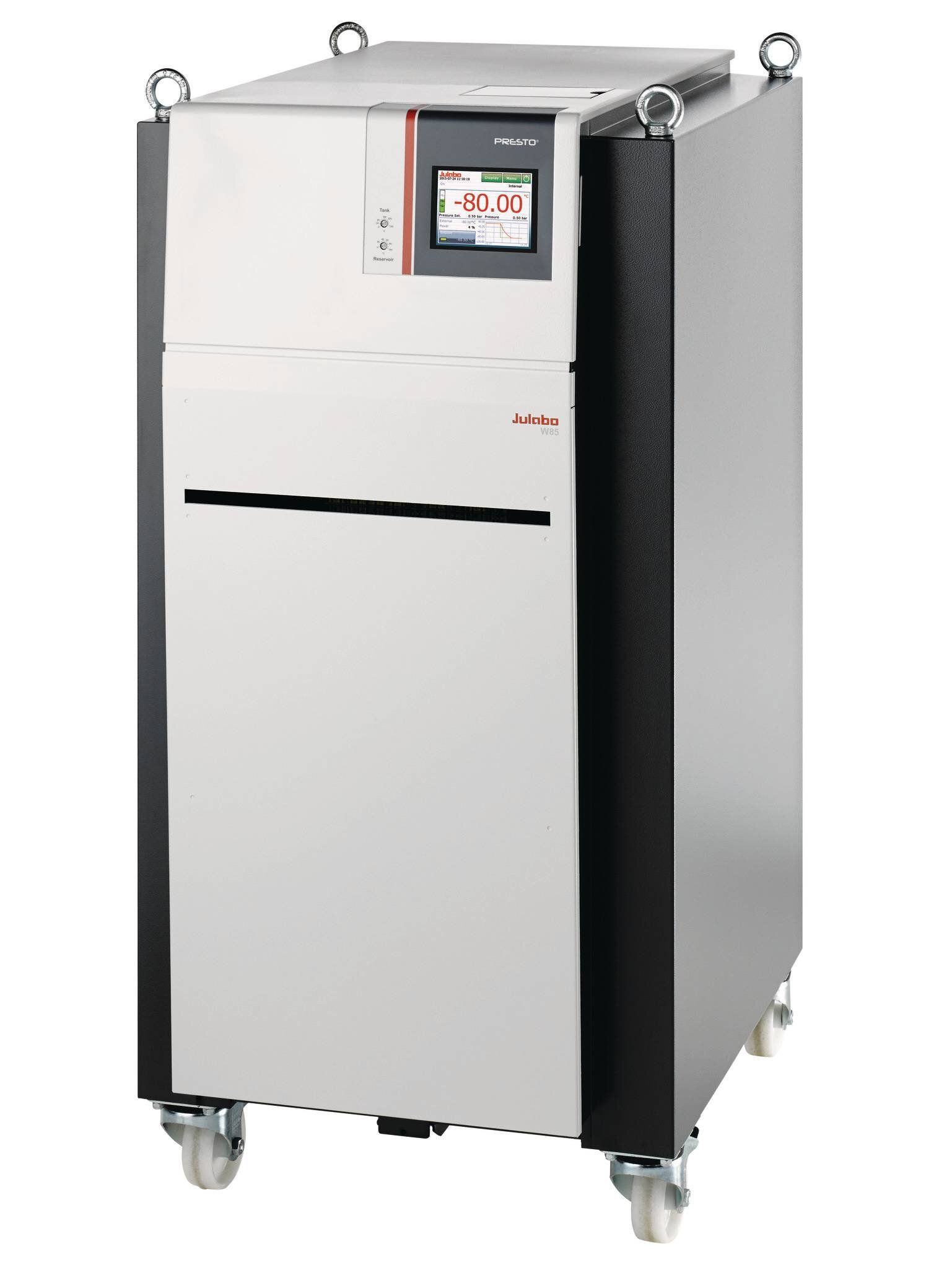 PRESTO W85t water-cooled, operating range -85…+250 °C with 12.5-15kW heating power. Cooling power: 2.5kW at 20 °C, 2.4kW at 0 °C, 2.4kW at -20 °C, 2.4kW at -30 °C, 2.4kW at -40 °C, 2.2kW at -60 °C, 0.4kW at -80 °C. Adjustable pump 0…80L/min; 1.5…43.5 PSI, 50cSt fluid viscosity maximum, M30x1.5 threaded pump connections. Minimal internal process volume 9.5L with 7L internal expansion volume. Dimensions: 24 x 33.3 x 49.2 inches (WxLxH); 738.5 lbs. 208-230V/3PPE/60Hz bare wire. R507/R23 refrigerants