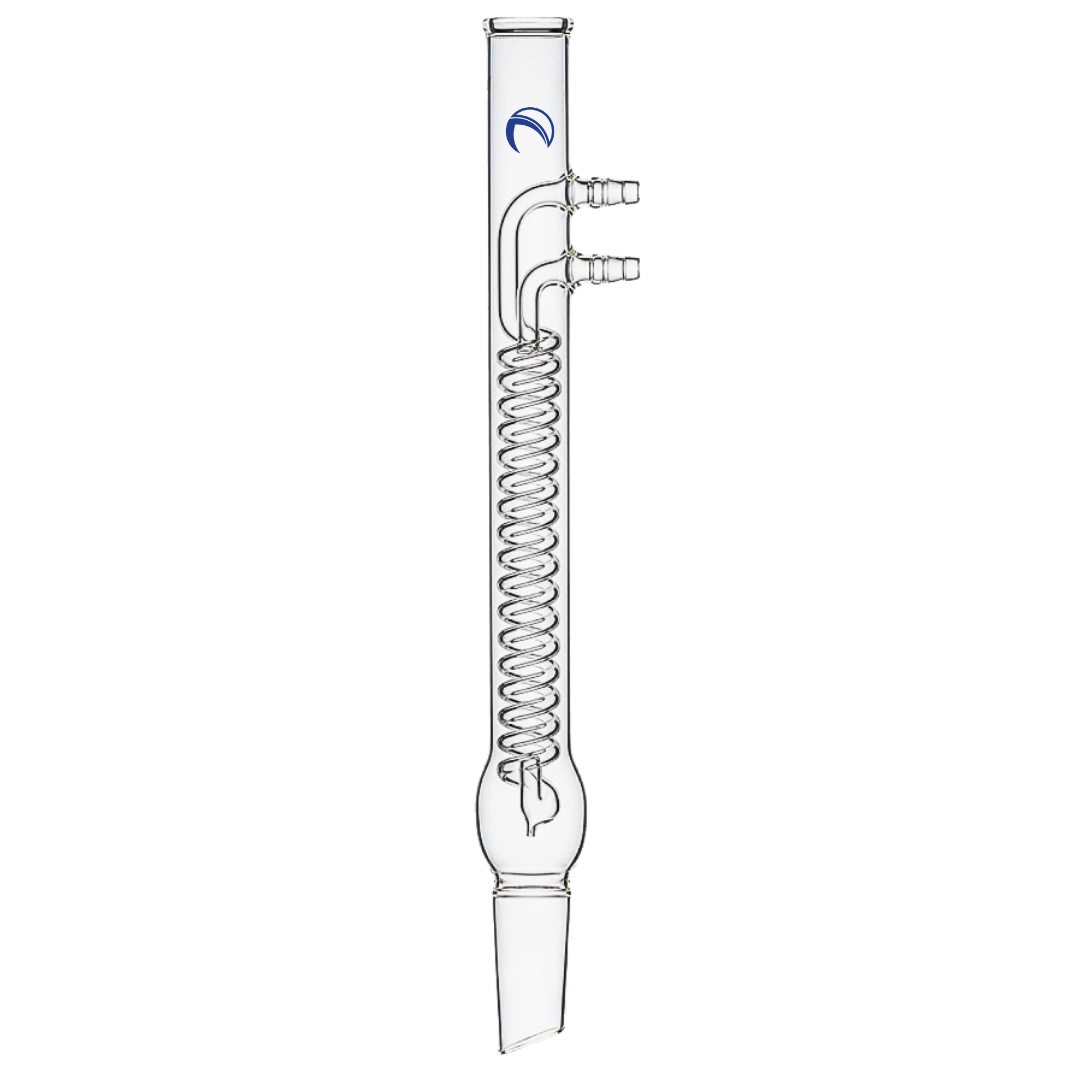 Coil condenser for refluxing with tightly wrapped coil. Hose connections at top on same side.