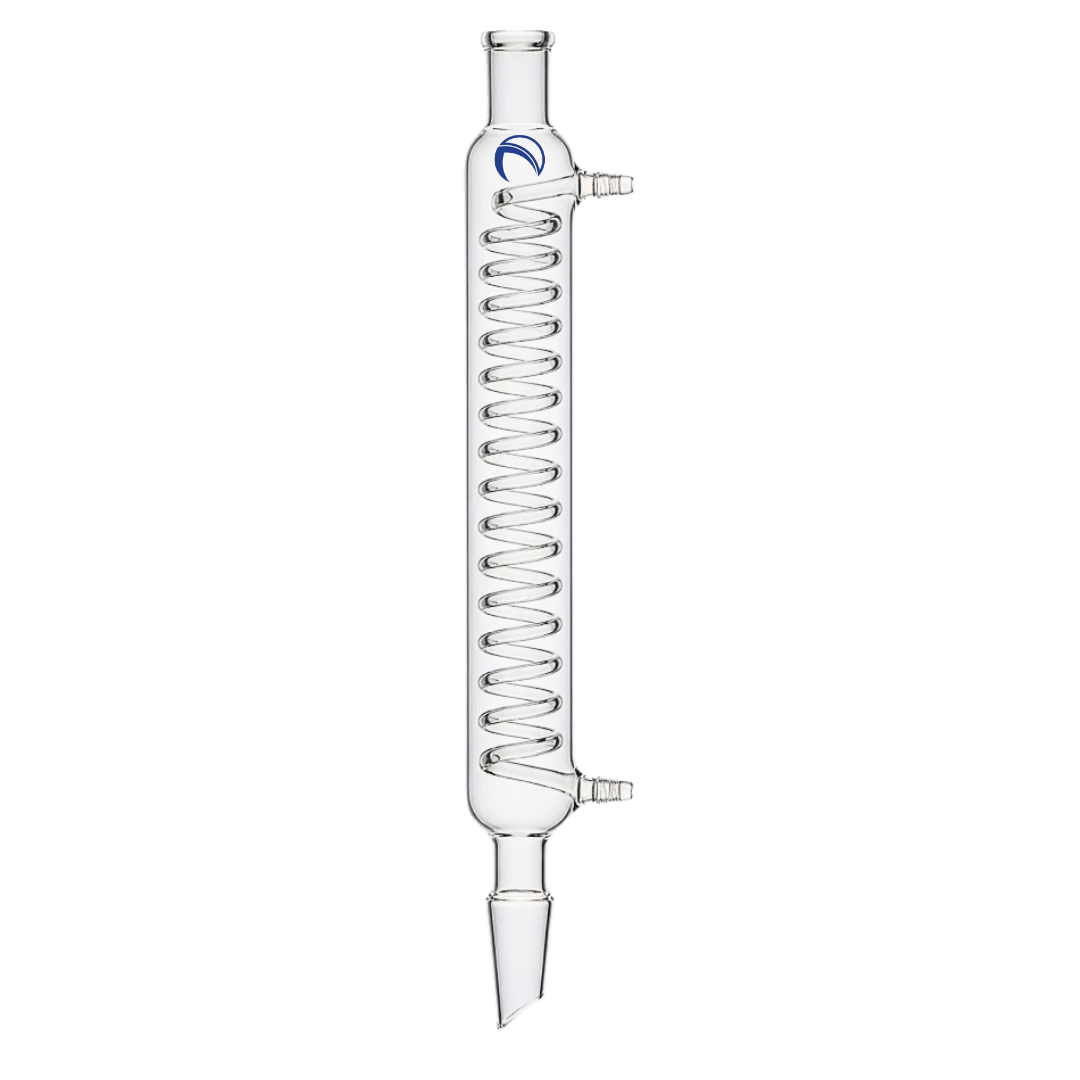 Coiled condensing tube, with coolant flowing through coil instead of within jacketed area.