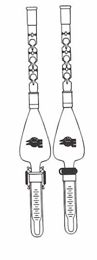 Used to concentrate trace amounts of sample dissolved in organic solvents. Setup consists of: one Snyder column (24/40 jts), one Kuderna-Danish Flask (24/40 top, 19/22 bottom), and one jacketed graduated concentration tube (19/22 jt).
