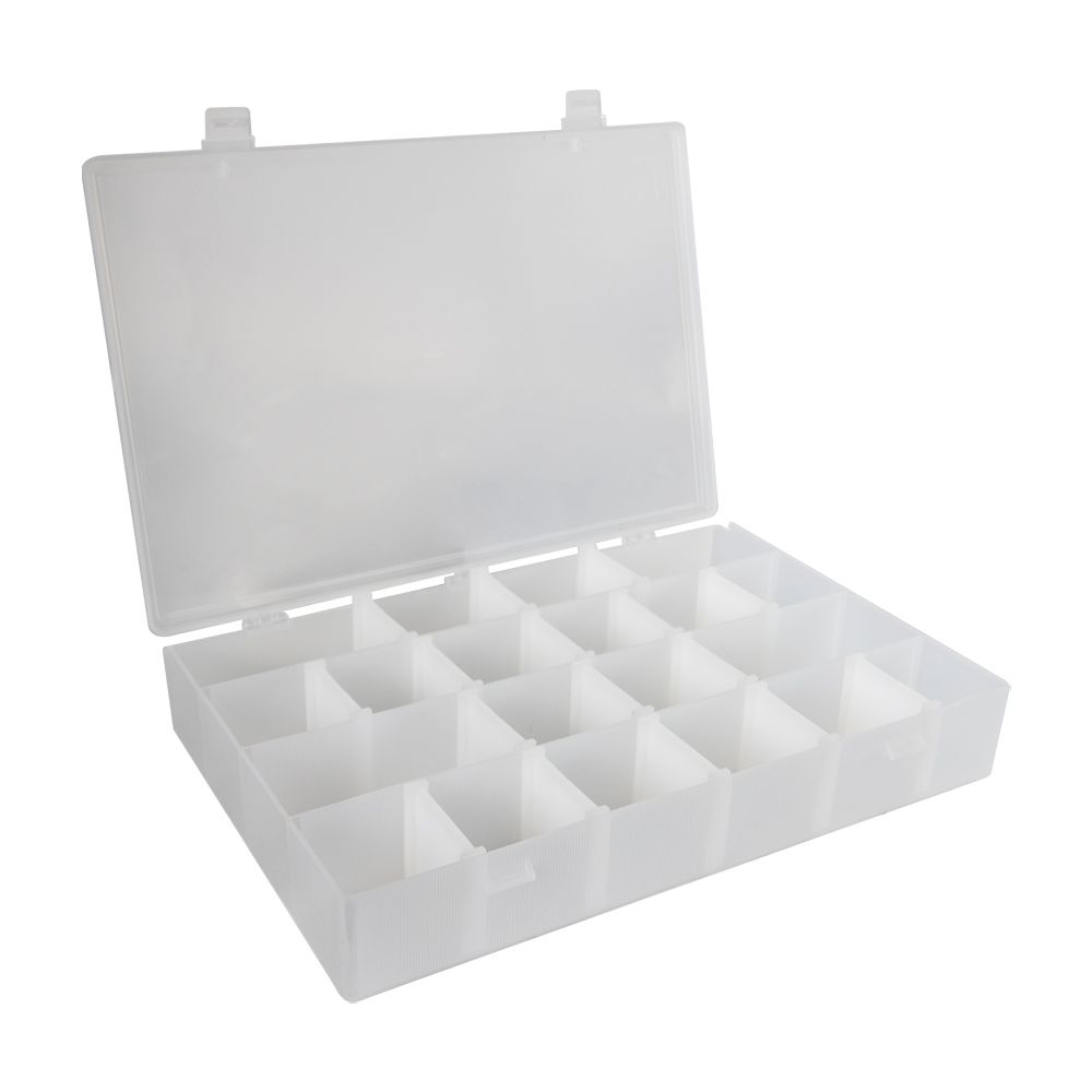 Polypropylene case with 16 Dividers/4 Compartments – 13-1/2″ L x 9-1/2″ W x 2-3/16″ Hgt. Dividers can be adjusted 1/16″ at a time 4 fixed compartments 13-1/2″ x 2-3/16″ running length-wise 16 IDS dividers